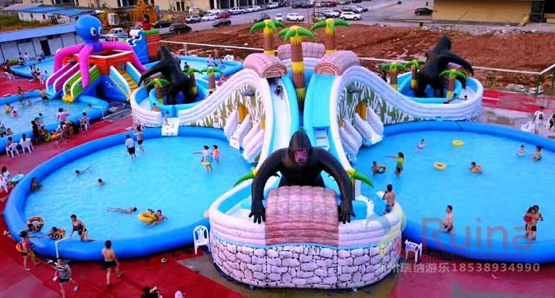 以猩猩林中搬運物品嬉戲為主題,人在林中穿梭,從而達到人景合一的境界;在設(shè)計結(jié)構(gòu)上是以三個對稱的滑梯組成,加上噴水的效果,給人以視覺上對稱的美感!每個滑梯下面都配有一個充氣水池,水池中放些水上浮具,如香蕉船、水狗、冰山等,讓移動水上樂園的玩法更加豐富。