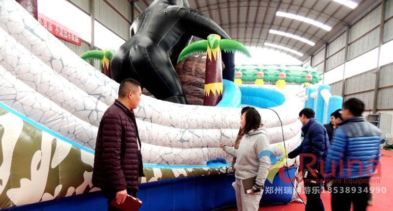 樂園中的三個黑色大猩猩造型被設(shè)計的異常逼真,讓游客忍不住會有前去和它合影留念的想法。滑梯的顏色則采用了和大山、巖石一樣的顏色,搭配及其合理,把花果山的造型形象的表述了出來,亦幻亦真,擁有如此優(yōu)美意境的一款全新移動水上樂園,相信將會給周圍游玩的人群帶來一種怦然心動的感覺,讓他們會產(chǎn)生一種前去游玩一番的沖動!